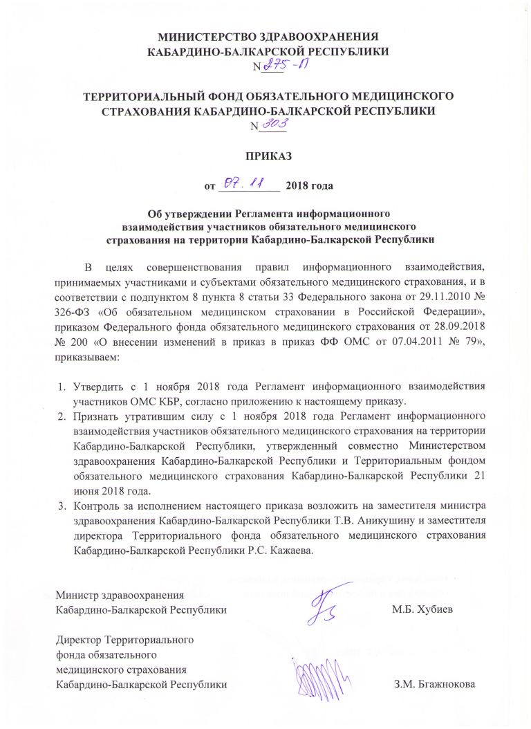 - Приказ от 07.11.2018 №303 (275-П) "Об утверждении Регламента информационного взаимодействия участников обязательного медицинского страхования на территории Кабардино-Балкарской Республики"
