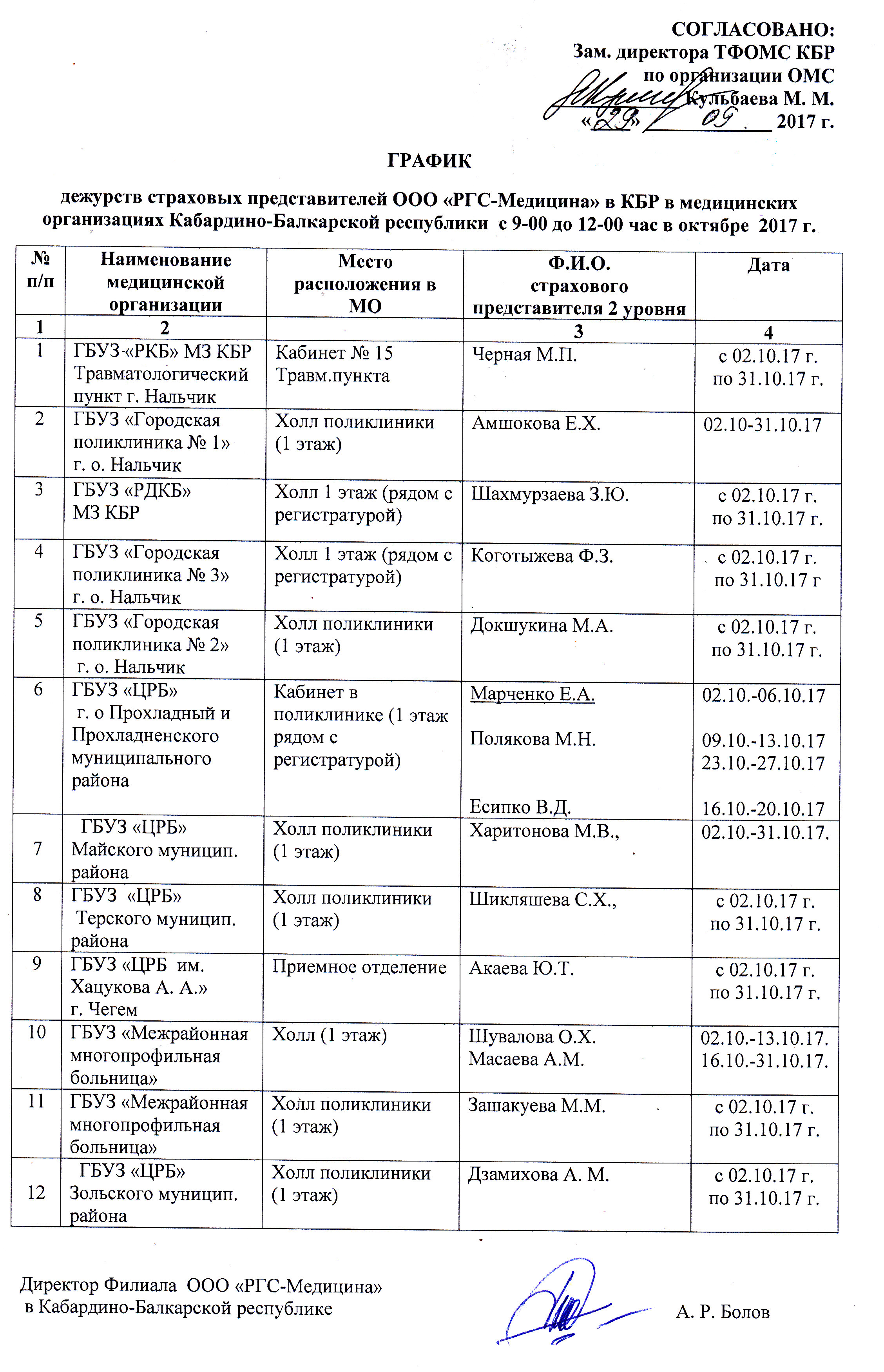 Графики дежурств представителей филиалов СМО в медицинских организациях сферы ОМС КБР на "Постах качества" в октябре 2017 г.